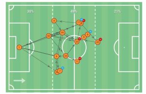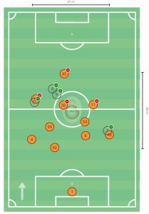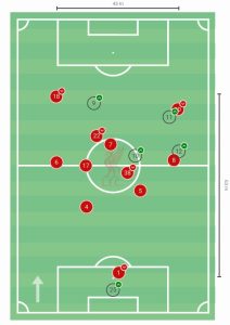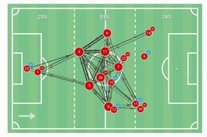 Her iki takımın oyuncuların ortalama pozisyonları üzerinden oluşan pas haritasına baktığımızda da Liverpool’un pas örgüsü ve yoğunluğunun ikinci bölgenin ortalarında yoğunlaştığını görüyoruz. Galatasaray’ın ise 1-0’ın da etkisiyle çok daha az ama öz pas yaptığı sonucuna varabiliriz.