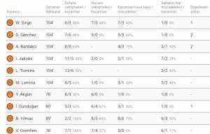 Galatasaray oyuncularının ikili mücadele sayılarına baktığımızda da Sanchez, Abdülkerim ve Barış Alper’in ön plana çıktığını görüyoruz. Bunun bu maç özelinde sadece bir taktiksel disiplinden ziyade mental bir adanmışlıkla da yakından ilişkili olduğu fikrindeyim.