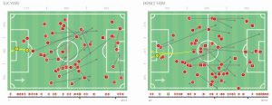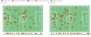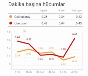 Dakika başına hücum verisinde de Galatasaray’ın özellikle 65-70’e kadar Liverpool işe başa başa oynadığını gösteriyor. 70’den sonra Liverpool’un hücum aksiyonlarının artması ise 1-0 geride oldukları bir karşılaşmada son derece doğal. Özellikle oyunun belli bir zaman diliminden sonra Liverpool’un en iyi yaptığı iş olan çizgide üçgenler oluşturduğunu ve bunun üzerinden hücum etme planlarını da izledik. Ancak Jakobs ve Singo’nun olağanüstü performansları Liverpool’un kenar organizasyonlar üzerinden skor bulmasının önüne geçti.